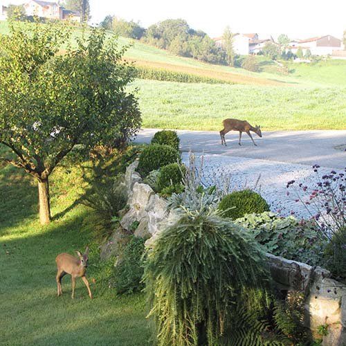 And finally, wild animals that were here long before us, feel comfortable and at home around our house – and that should remain unchanged. For instance, the two bats, deer, hares, fire salamanders and all the rest of them. There are areas on the property that are left untouched so that e. g. wildflowers and nettles can grow as food plants for butterflies.
