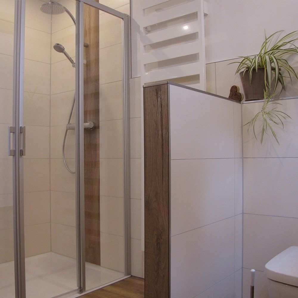Extrem flache Duschwanne mit Echtglas Kabine (1 m x 1 m) und Thermostat-Armatur, Design-Badheizkörper, Waschplatz mit Spiegelschrank, Toilette und Waschmaschine, Föhn, Hand- und Duschtücher, Fliesenboden, Fußbodenheizung.