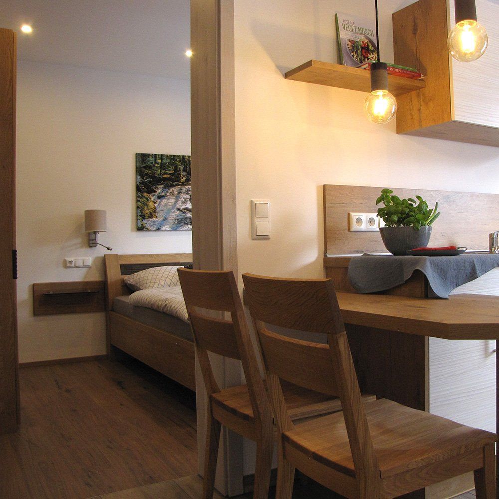 Deswegen haben wir neben schönen Möbeln Wert auf gute Matratzen gelegt, die Ihren Rücken sowohl sanft entlasten als auch stützen. Direkt vom Bett aus können Sie ab dem Frühjahr den morgendlichen Reviergesängen der Waldvögel lauschen.