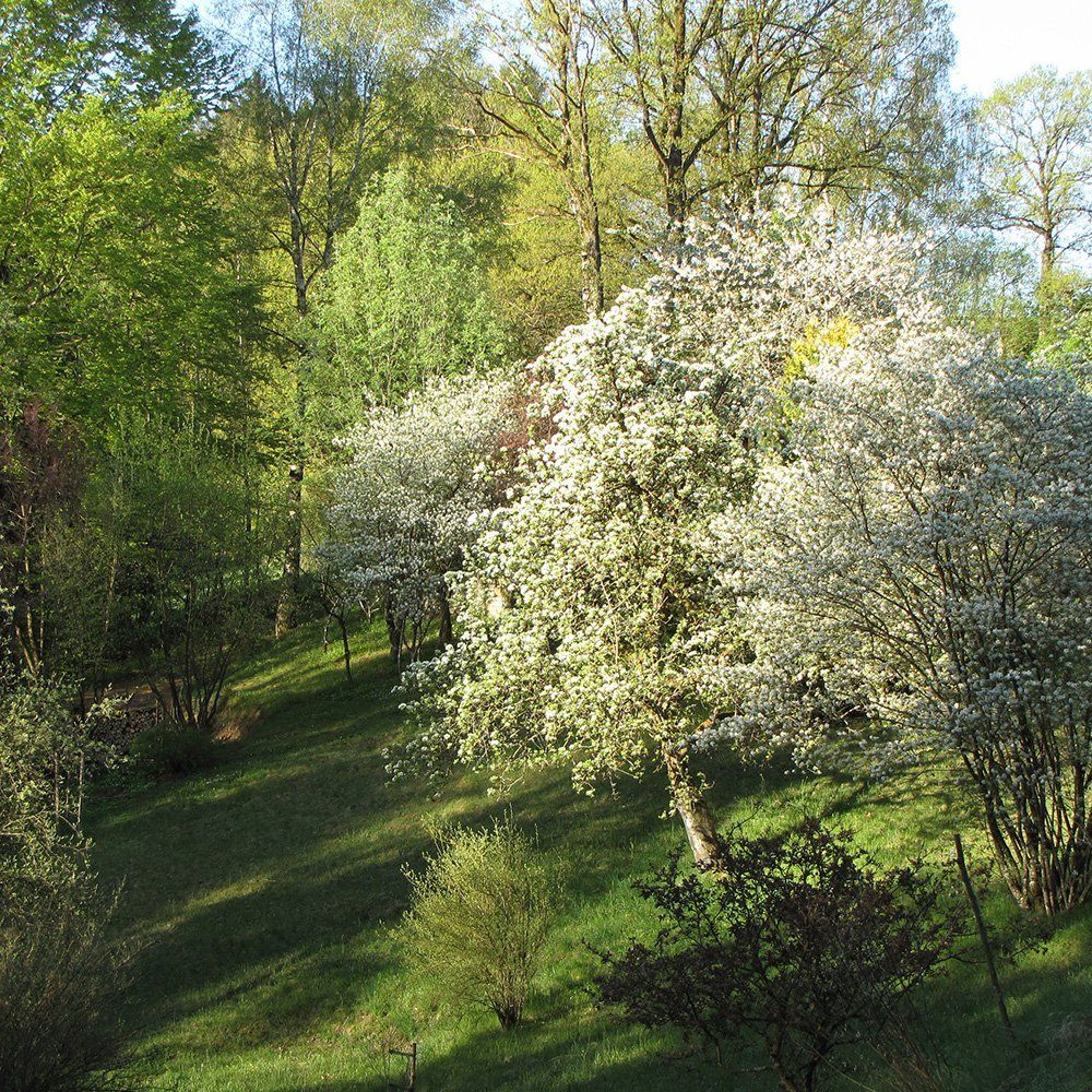 Der größte Teil der Hangwiese ist eine sogenannte „Magerwiese“, d.h. sie wird nicht gedüngt und wächst langsam. Hier finden allerhand Insekten wie Bienen, Hummeln, Schmetterlinge und Grillen an den blühenden Wiesenblumen Nahrung. Gemäht wird nur ein- bis zweimal im Jahr mit dem Mähbalken. Dann duftet es herrlich nach Thymian und Heu.