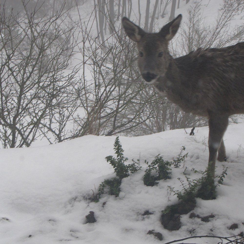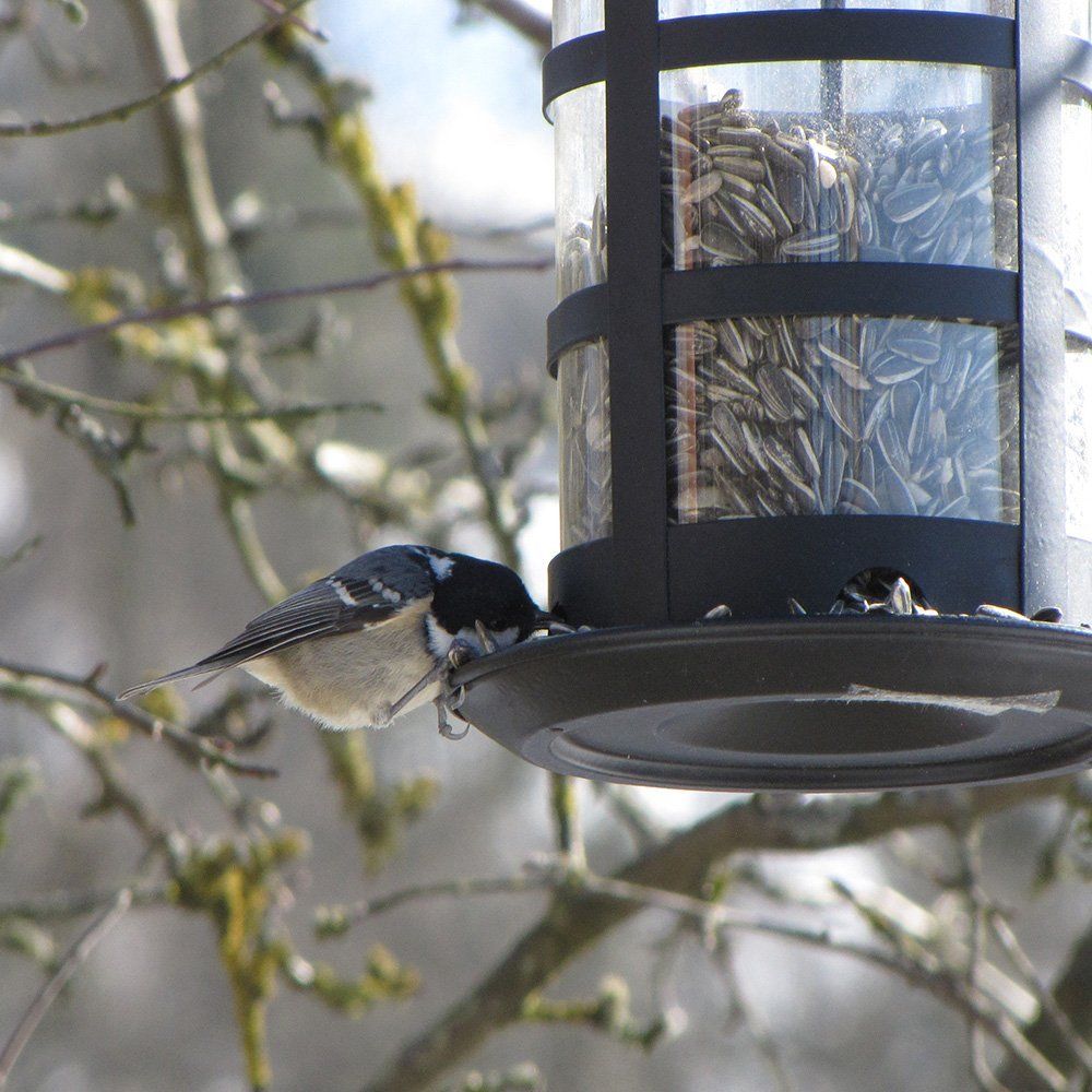 Wenn Schnee liegt – das ist meistens im Januar/Februar – fällt erst so richtig auf, wie viele Wildtiere durch das Grundstück streifen. Dann sieht man die Spuren von Rehen, Hasen und Vögeln. Für letztere steht auf der Terrasse ein Futterhaus, so dass Sie vom Wohnzimmer aus Kleiber, Meisen, Specht und Kollegen beobachten können.